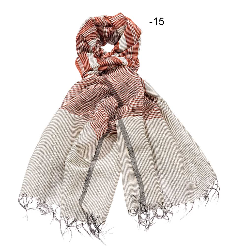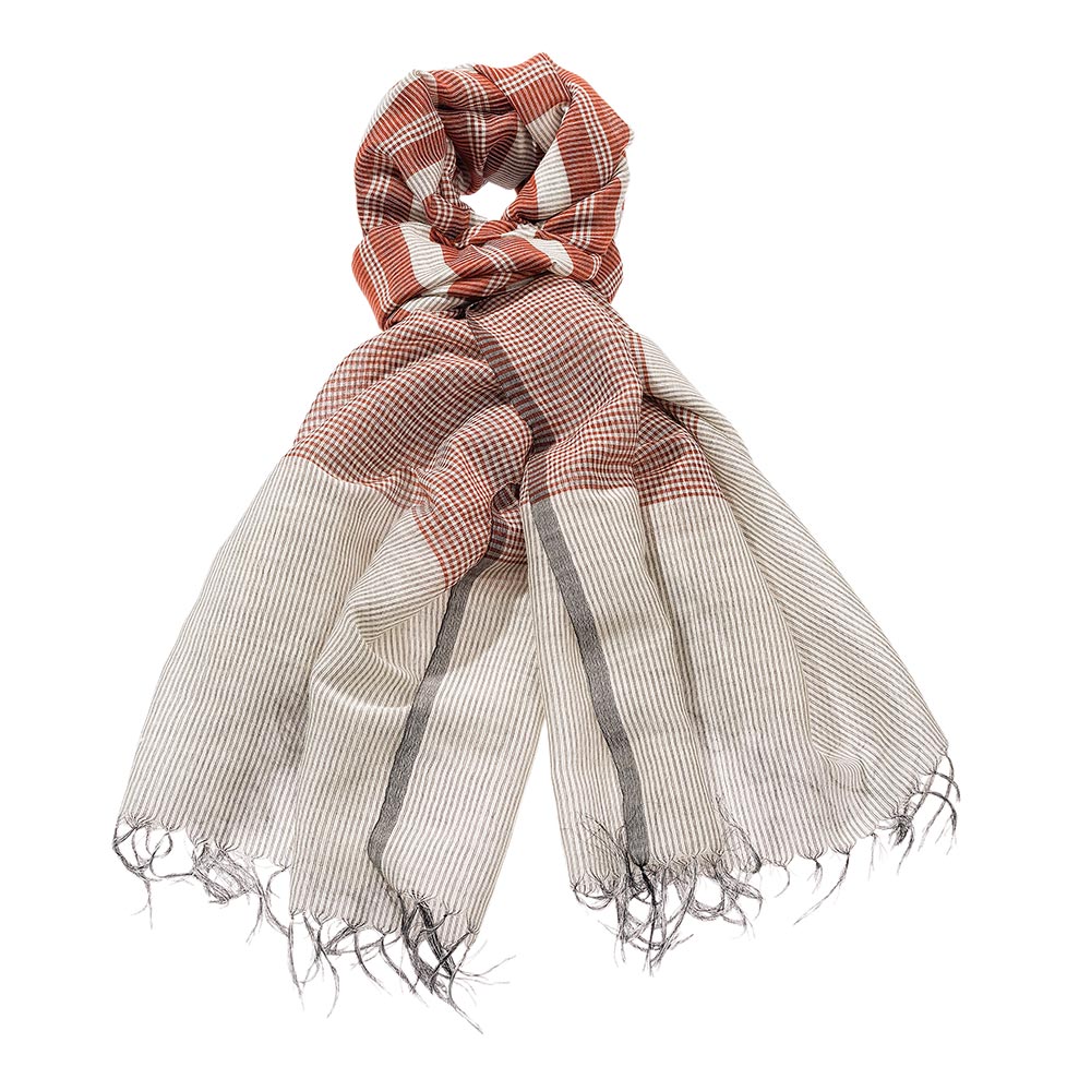 IN2-22-014-15 Schal, mit feinem Karo-/Streifenmuster, mit gedrehten Fransen, hellgrau mit braunrot, Wolle/Seide (50/50), 70x180
