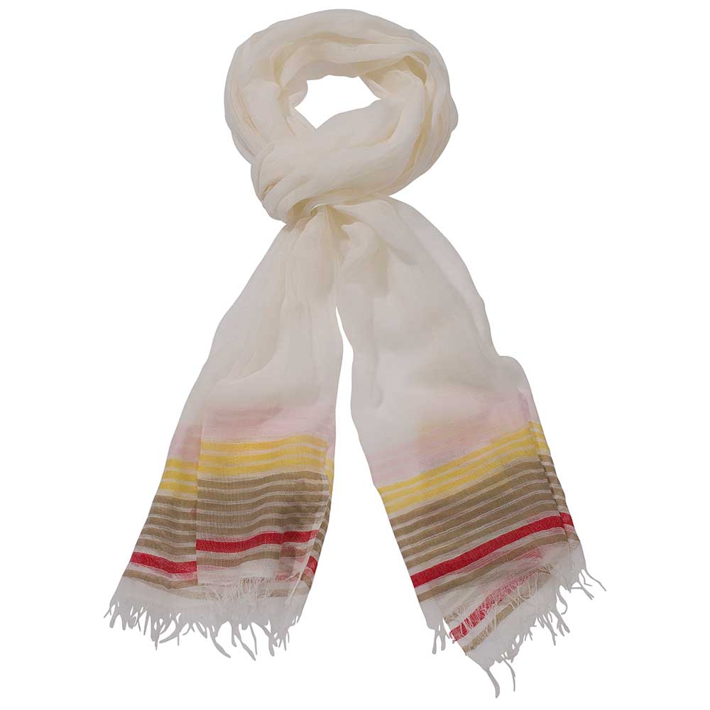 IN2-22-018 Schal, handgewebt, mit feinem Streifenmuster, weiß mit gelb/rot/rosé/braun, mit Fransen, Baumwolle, 55x180
