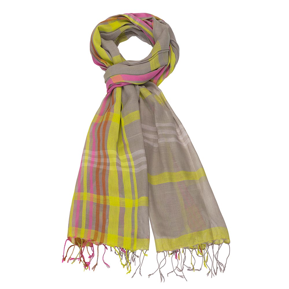 IN2-22-034 Schal, handgewebt, mit Karo-/Streifenmuster, mit Fransen, grau mit pink und zitronengelb, Baumwolle, 90x190