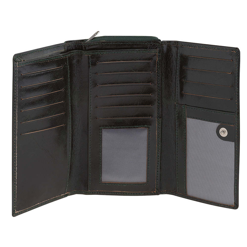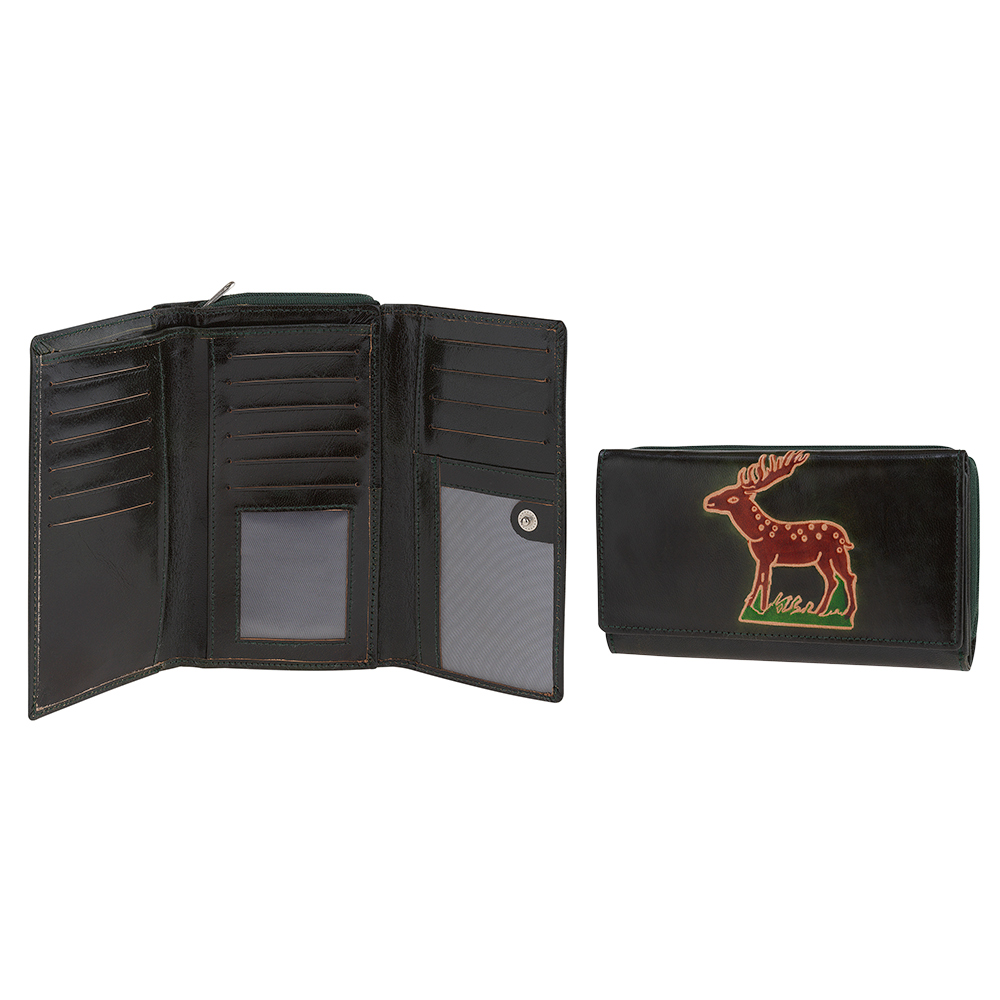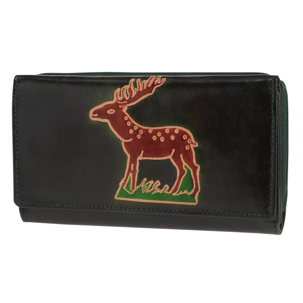 IN2-25-053 Geldbörse mit Reißverschluss und vielen Kartenfächern, grün mit Hirschmotiv, Ziegenleder, 17x10x3,5
