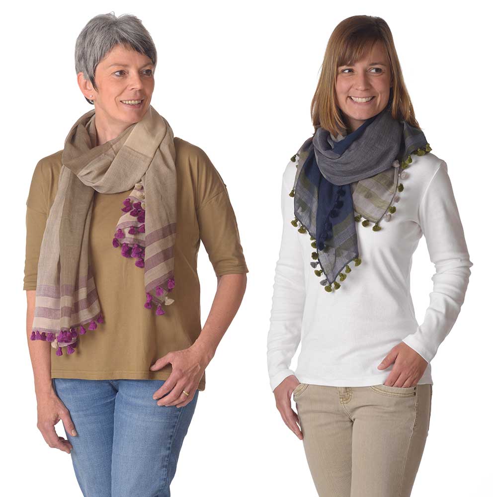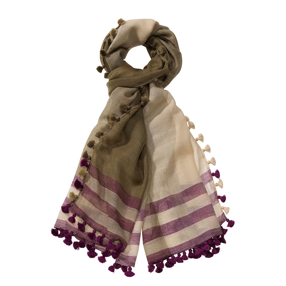 IN3-22-117-09 Schal, handgewebt, mit Troddeln, Beigetöne mit lila, Wolle, 60x180