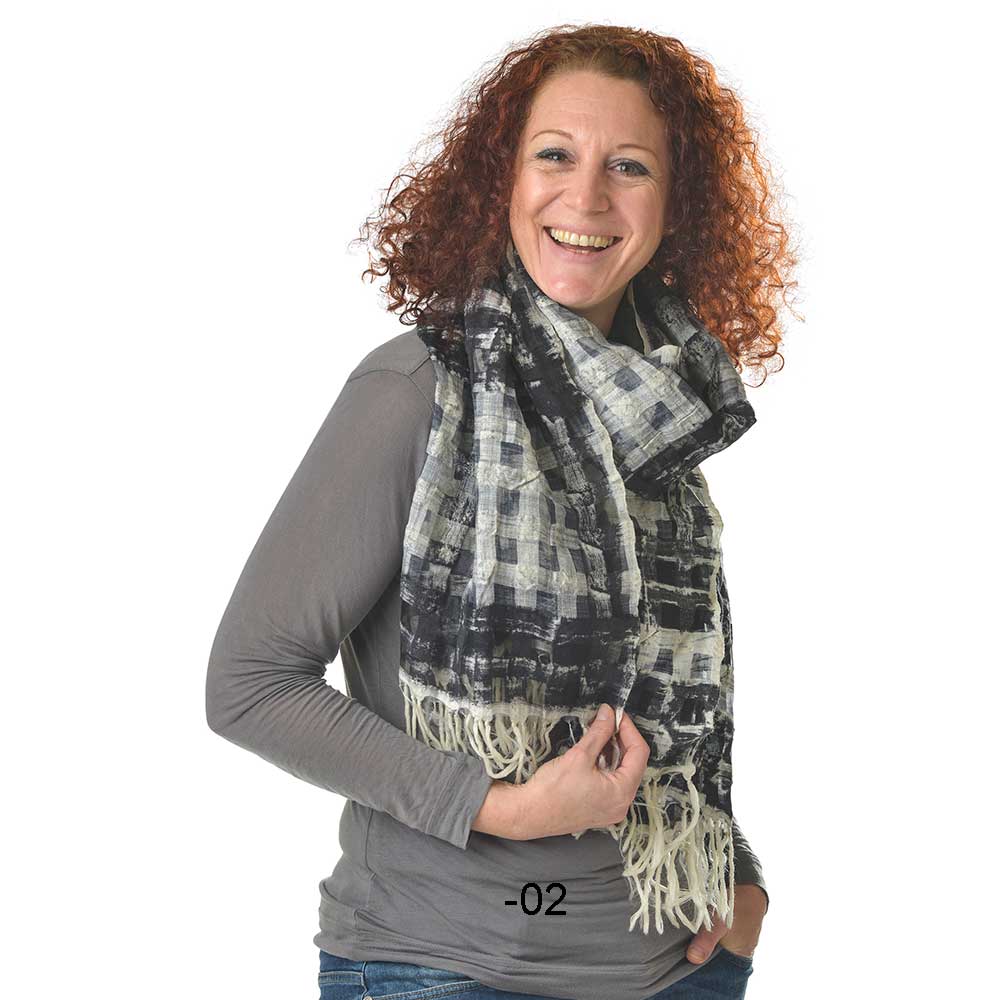 IN3-22-139-02 Schal, handgewebt, kariert mit Fransen, schwarz/grau/natur, Wolle/Seide (50/50), 65x185
