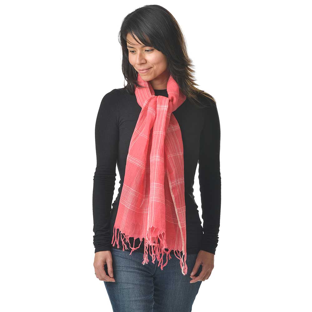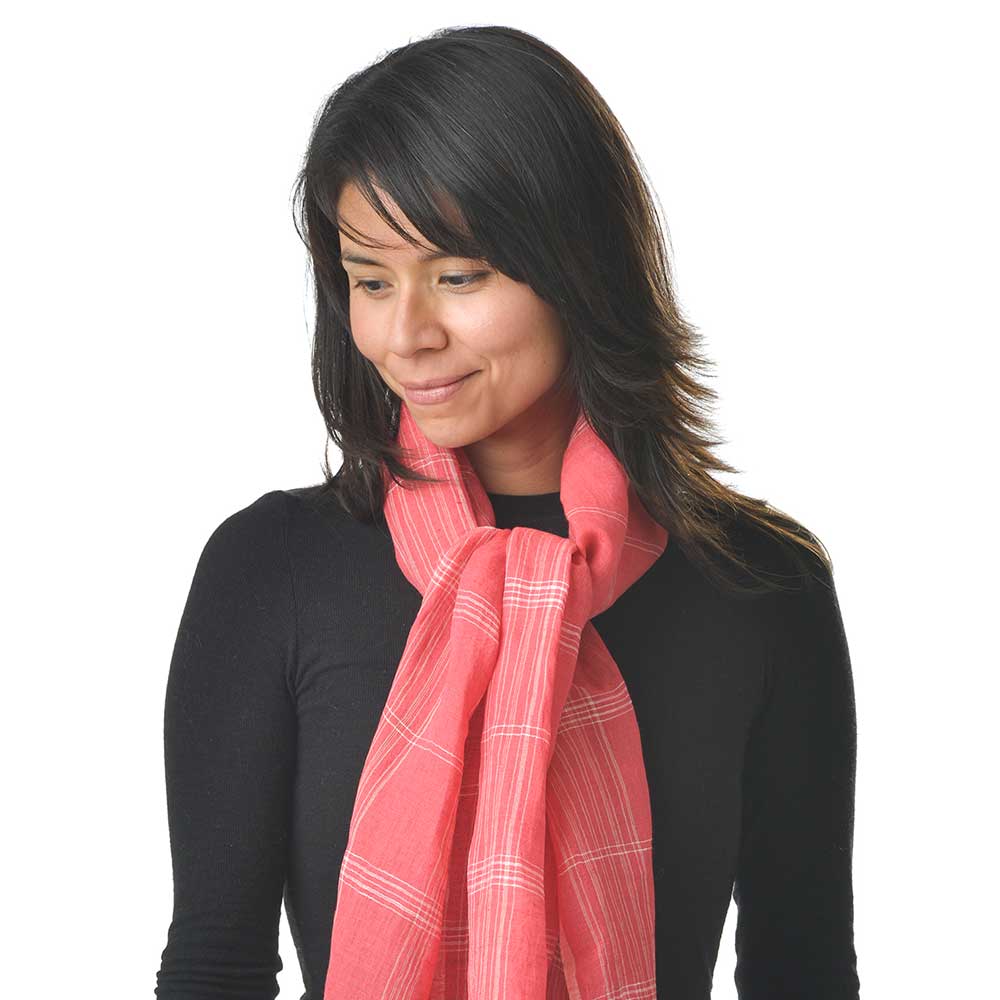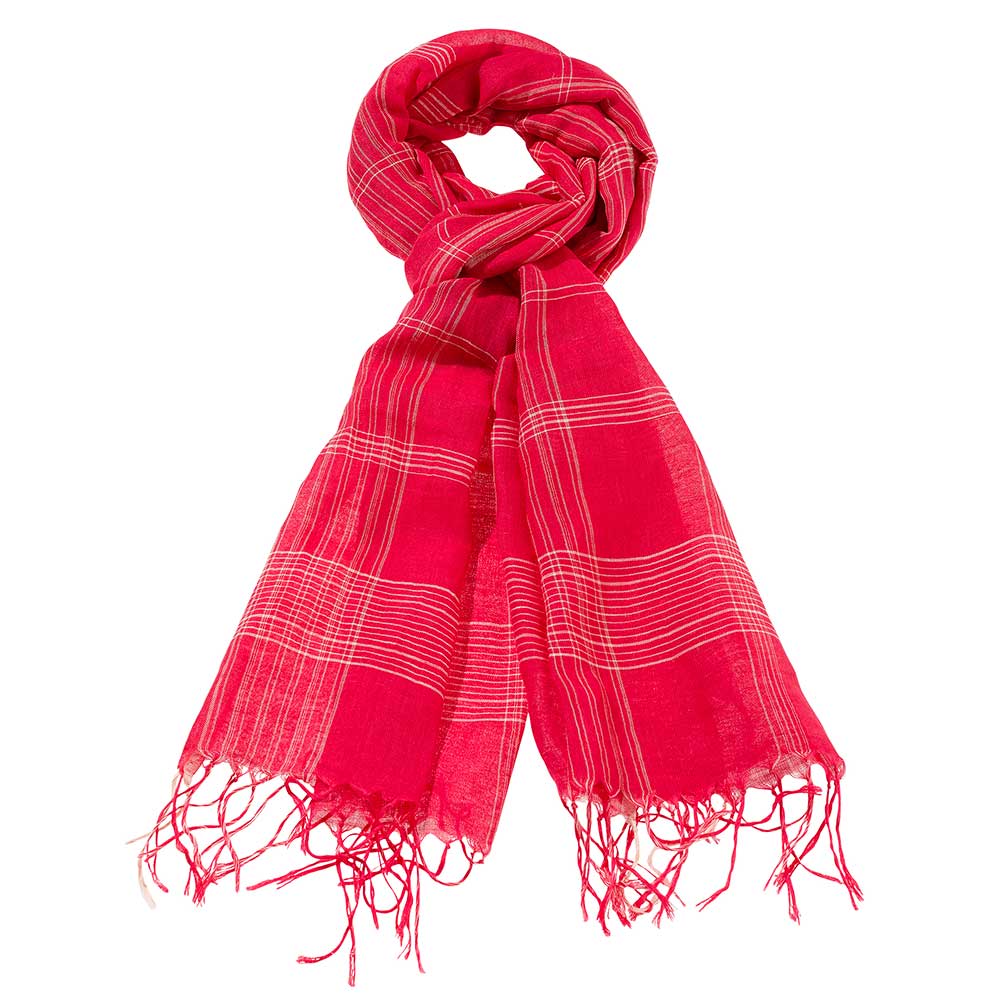 IN3-22-143 Schal, handgewebt, kariert mit Fransen, rot, Leinen/Baumwolle (60/40), 50x180