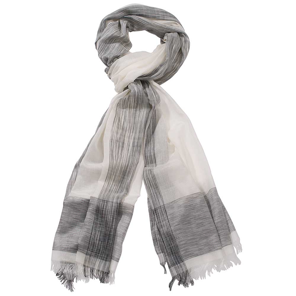 IN3-22-150 Schal, handgewebt, schwarz/weiß mit Fransen, Seide/Baumwolle (55/45), 60x200