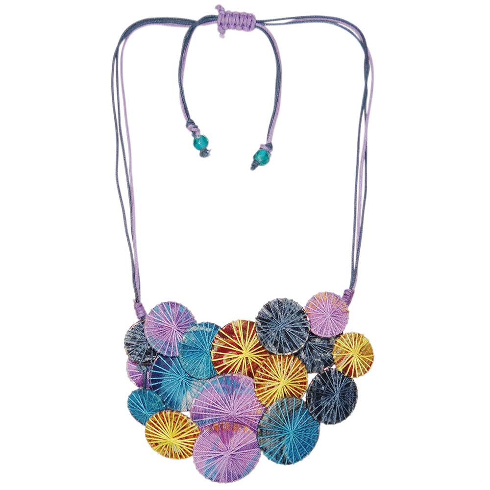IN6-33-157 Halskette, dreireihig, mit Stoff und Garn überzogene Messingringe, lila/gelb/petrol, Glasperlen, Messingperlen, L28-40