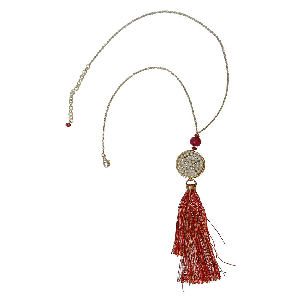 IN6-33-171 Halskette, Glas- und Hornperlen, mit Troddel, goldfarben mit rot und weiß, Messing, L40-43