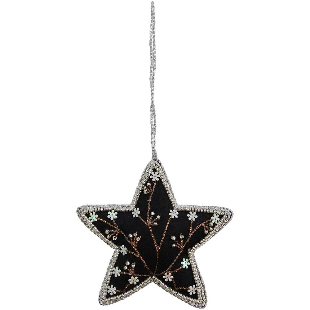 IN6-45-026-01 Anhänger "Stern", schwarz mit weißen und silberfarbenen Glasperlen und kupferfarbener Stickerei, Baumwolle, D9