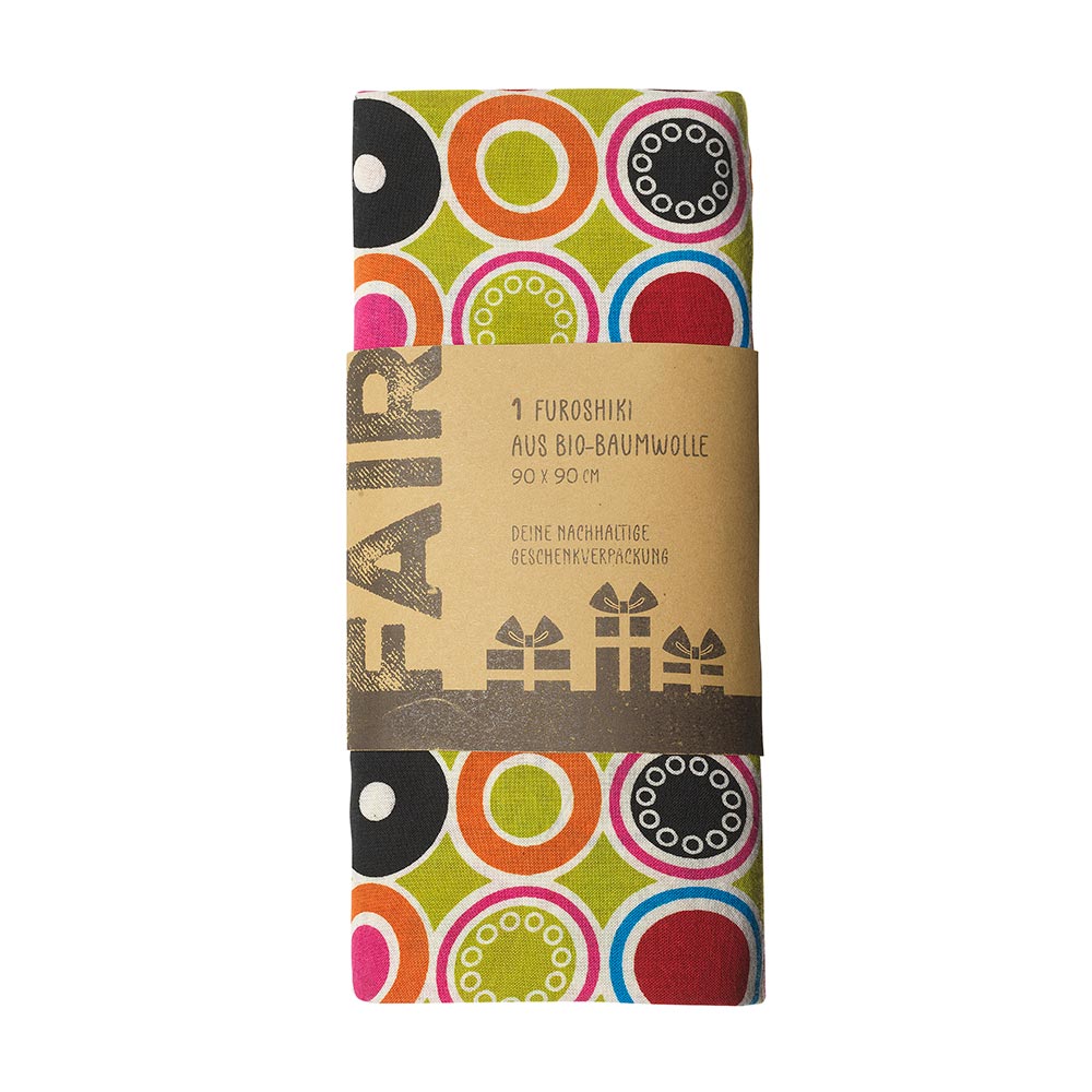 IN8-22-070-06 Furoshiki, nachhaltige Geschenkverpackung, hellgrün mit bunten Kreisen, Bio-Baumwolle, 90x90