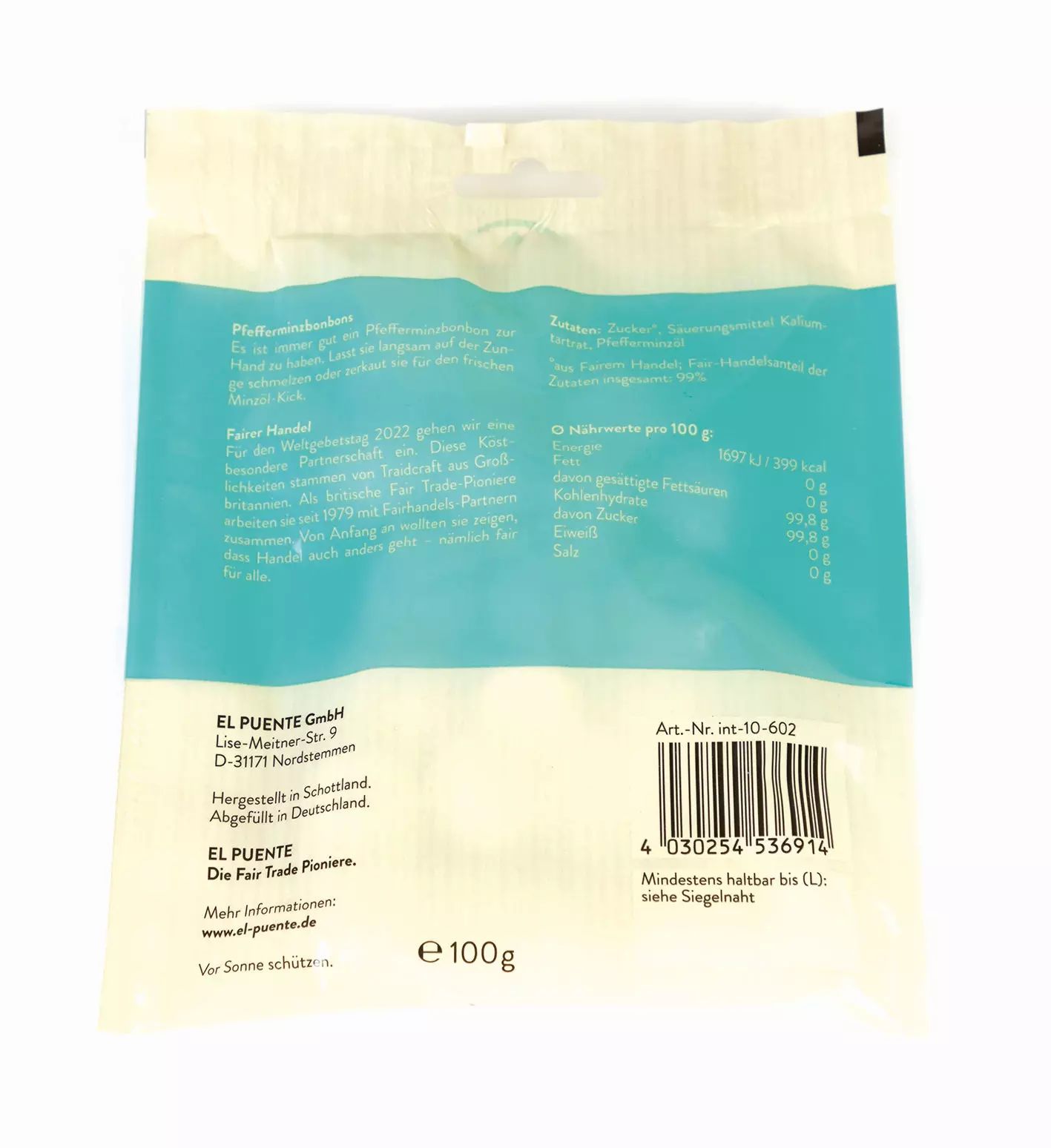 InfozeileZucker von Fair Trade Produzent*innen, Verarbeitet mit Mengenausgleich, 100 g
