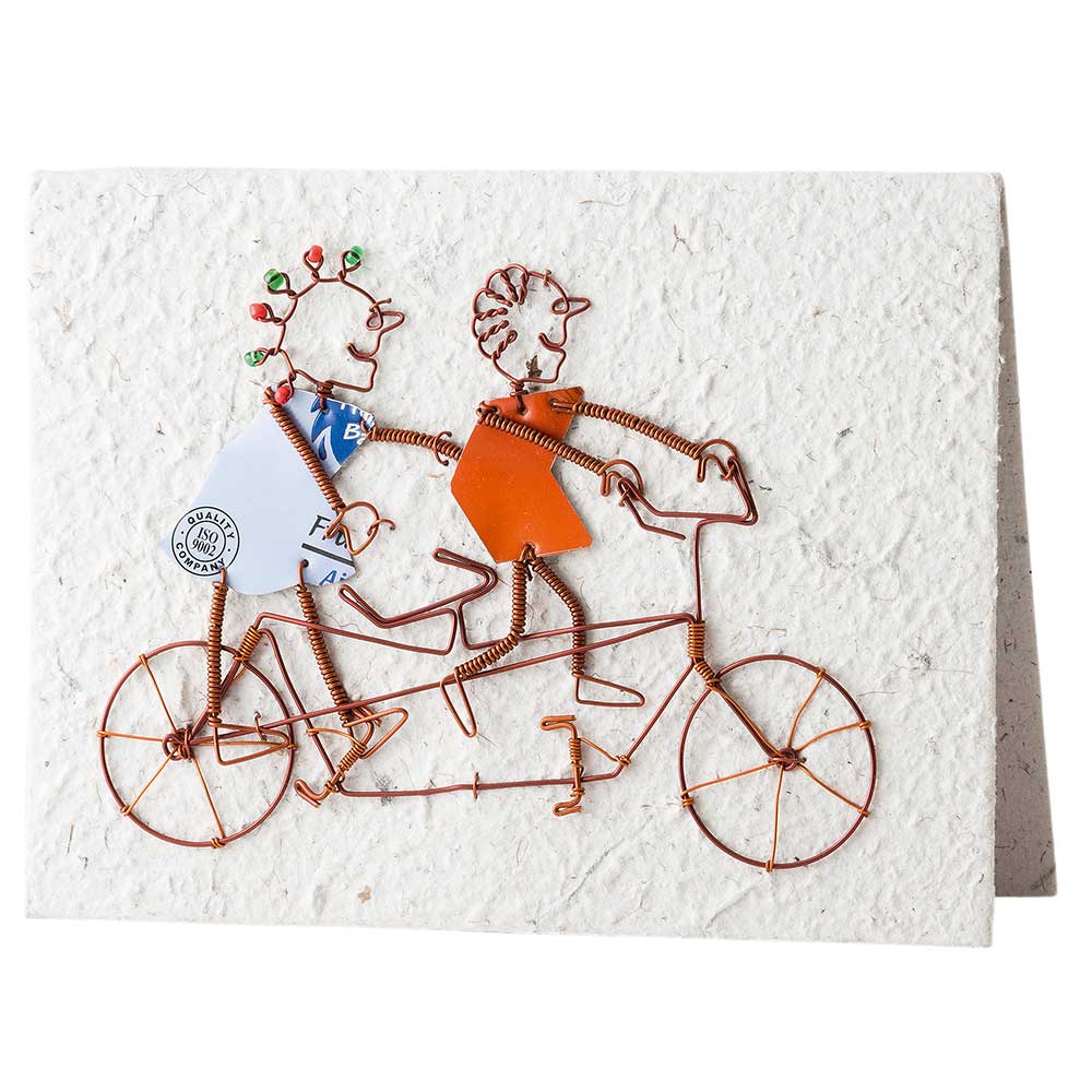KE6-95-001 Grußkarte "Paar auf Fahrrad", beige, mit Umschlag, handgeschöpftes Papier, Motiv aus Blech, 12x16