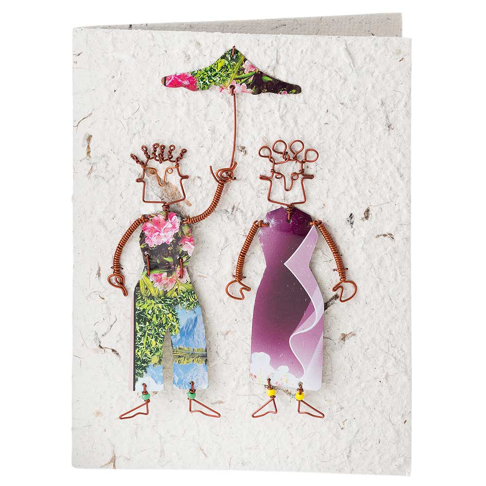 KE6-95-003 Grußkarte "Paar mit Schirm", beige, mit Umschlag, handgeschöpftes Papier, Motiv aus Blech, 12x16