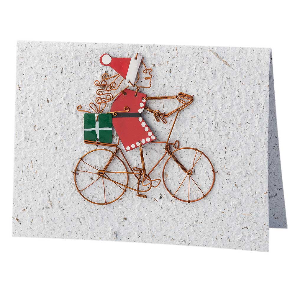 KE6-95-008 Weihnachtskarte "Weihnachtsmann auf dem Fahrrad", beige, mit Umschlag, handgeschöpftes Papier, Motiv aus Blech, 12x16
