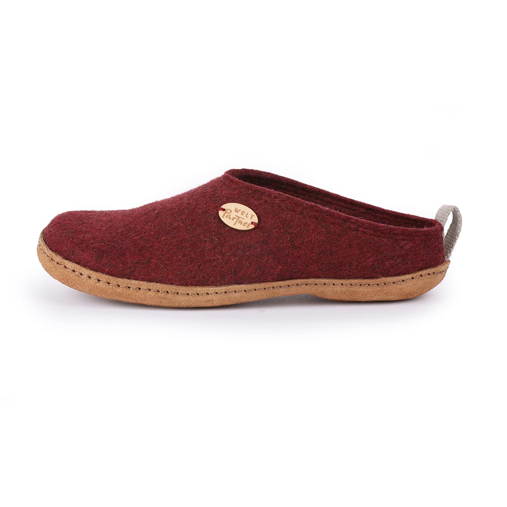 KG1-29-001-03-62 Hausschuhe, hinten offen, bordeauxrot, Wollfilz, Sohle vegetabil gegerbtes Leder, Größe 38