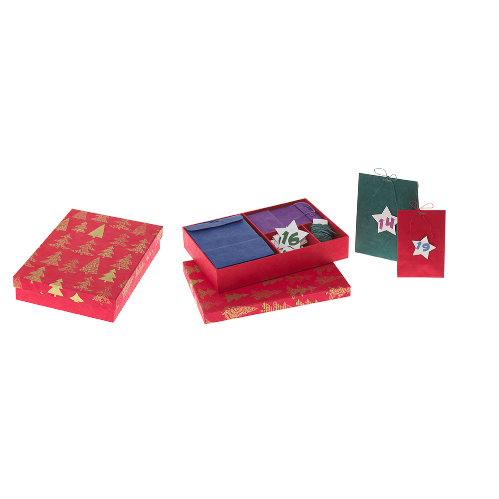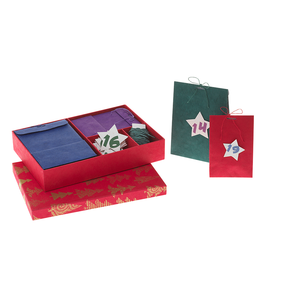 NE4-45-029 Adventskalender zum Selberbestücken, je 12 Tütchen á 11x16x6 und 8,5x12,5x4,5, in Schachtel (rot mit goldfarbenem Druck), handgeschöpftes Recyclingpapier