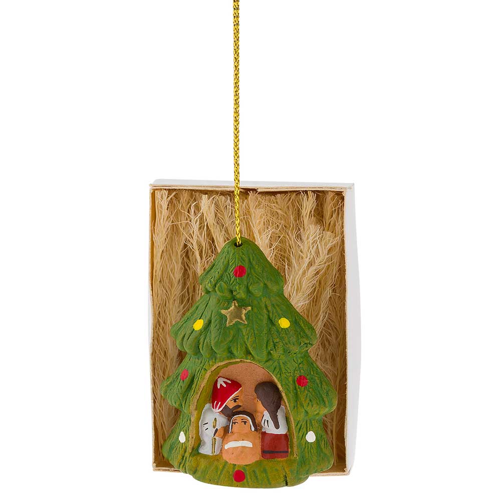 PE3-45-123 Kleinkrippe in Schachtel als Anhänger "Weihnachtsbaum", grün, Ton, H5,5