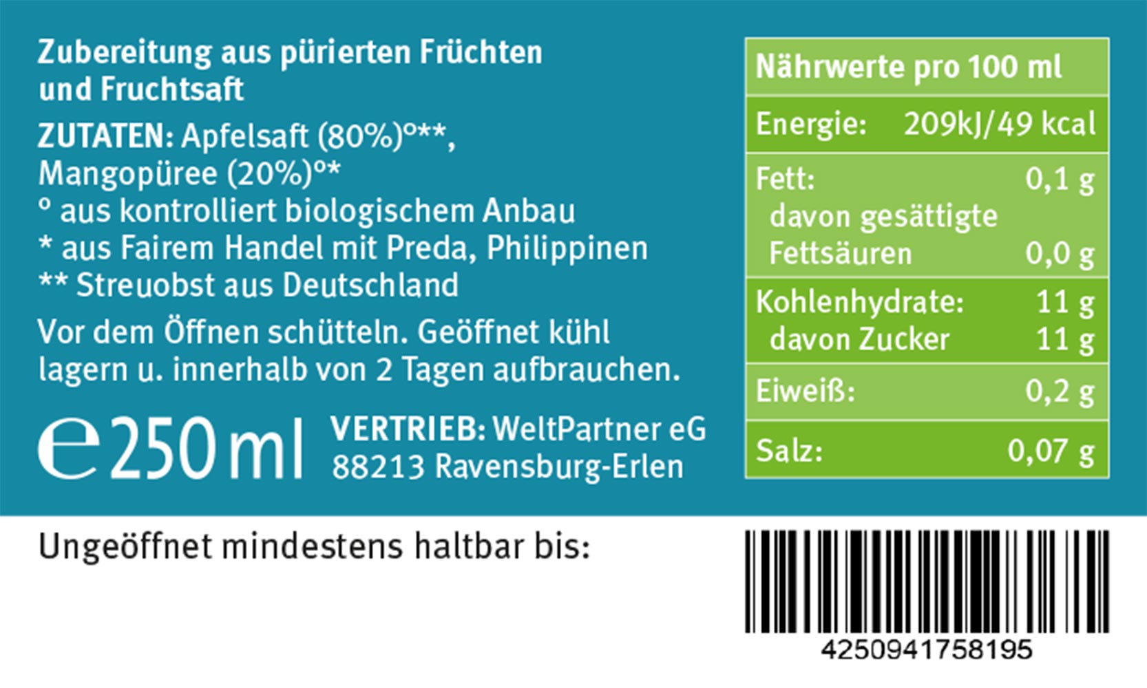 PH8-17-071 Apfel-Mango-Saft, bio°, 12 x 250ml Glas-Einweg-Flaschen (Set), 80% Apfelsaft von oberbayerischen Streuobstwiesen/20% Mangopüree von PREDA (Philippinen), vegan