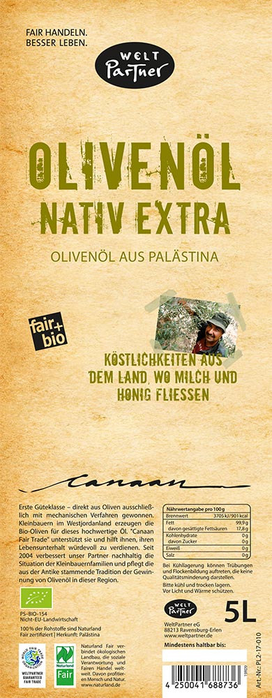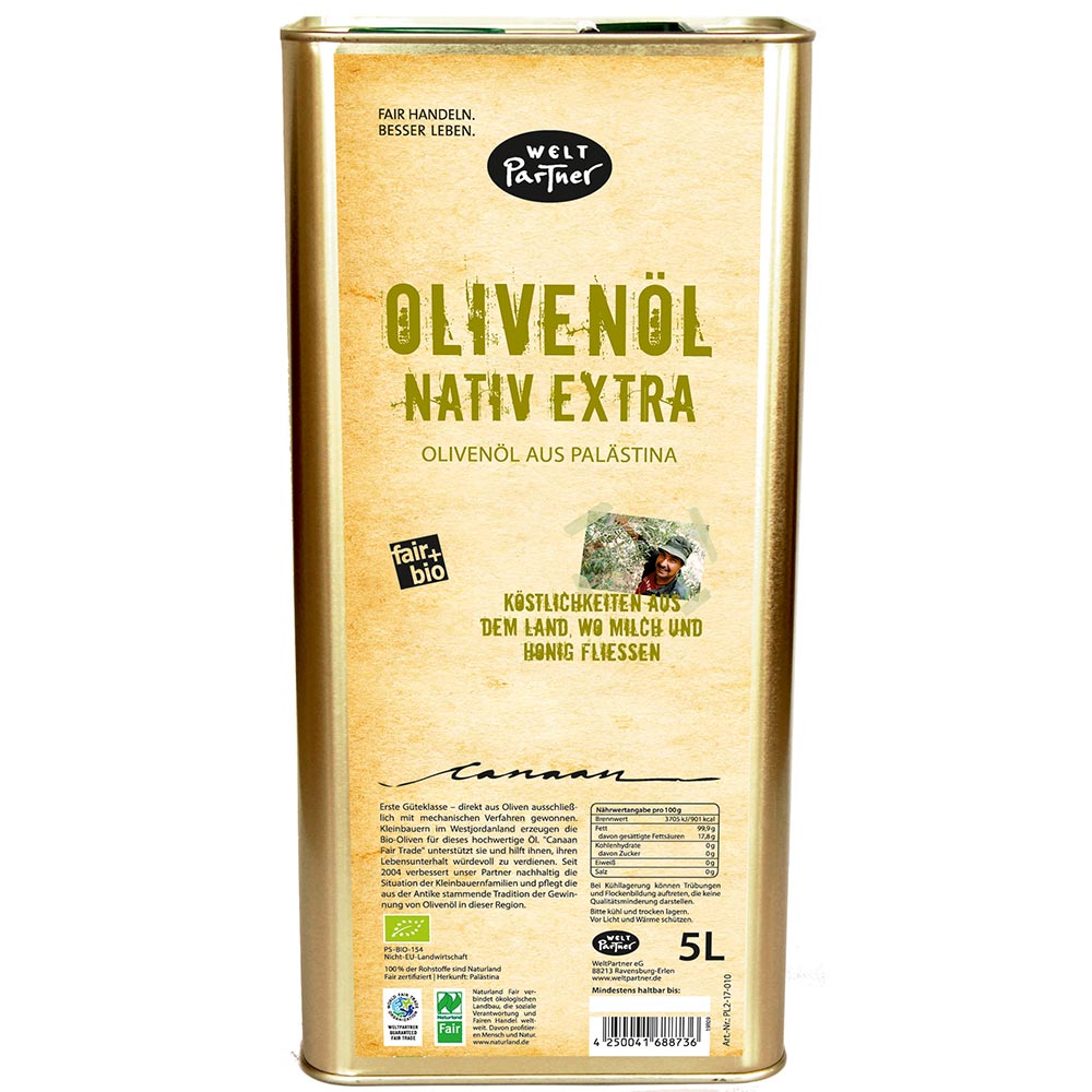 PL2-17-010 Olivenöl, bio°, FLO/Fairtrade (FLO-ID Produzent: 20395, FLO-ID WeltPartner: 2857), Großpackung: 5L-Dose