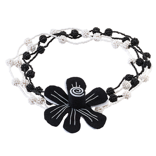 SA3-33-001-02 Halskette, zweifarbige Glasperlenkette mit dekorativer Filzblume, schwarz-weiß, L46