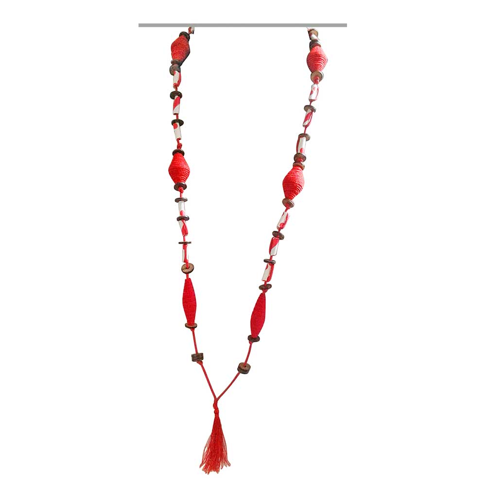 SL1-33-004 Halskette, aus Stoffresten, Baumwolle, rot mit weiß, mit Perlen aus Holz und Strohhalmen (Kunststoff), L55