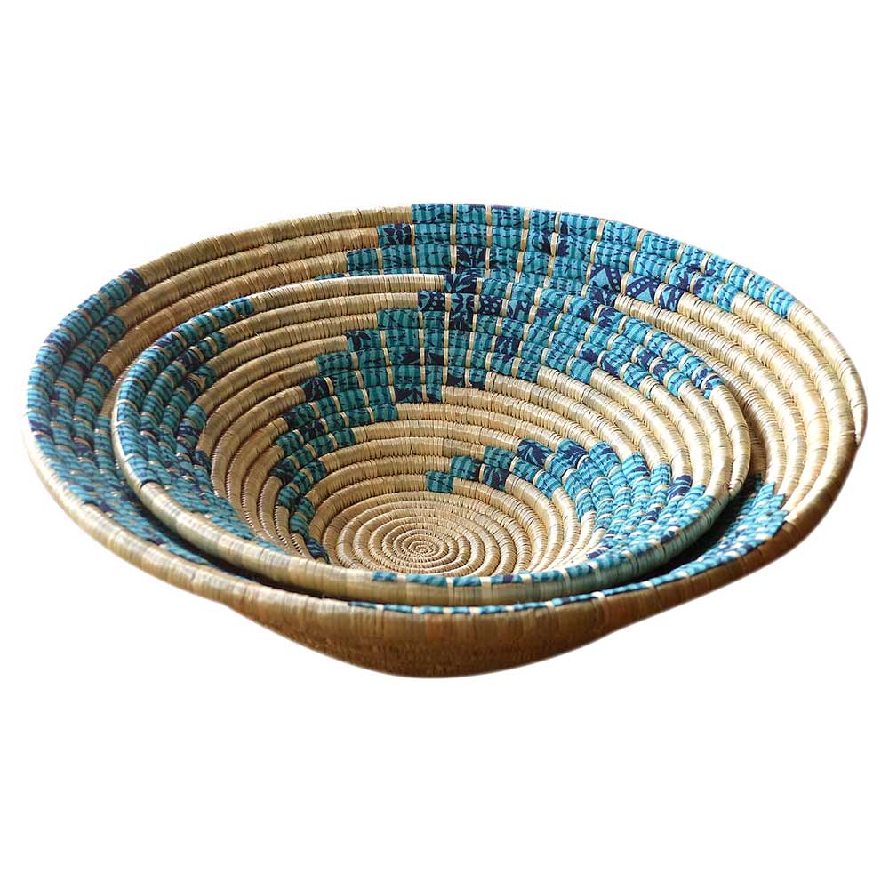 TZ2-59-016 Korb, natur, Papyrus/Sternwurzel geflochten mit Bananenblatt und türkisfarbenem Kitenge (Baumwolle), D35, H11